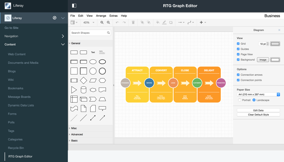 Die direkte Integrierung in die Liferay Document Library ermöglicht zudem das Einbinden erstellter Grafiken als gewöhnliches Liferay-Dokument an beliebigen Stellen im Portal. Zudem stehen die üblichen Standard-Features für Dokument uneingeschränkt zur Verfügung: Automatische Vorschau, Versionierung, Workflows, Verwaltung von Metadaten und Berechtigungen. Graphen können zudem direkt über die Document Library angelegt und bearbeitet werden. Zusätzlich steht der Editor optional als separates Portlet auf jeder beliebigen Portalseite zur Verfügung. Zahlreiche Standardformen für Ihre Grafiken, die unkomplizierte Bedienung und ein Export als Bild, PDF, SVG oder XML runden den Funktionsumfang ab.
