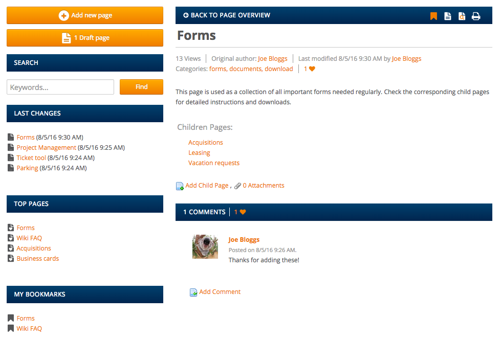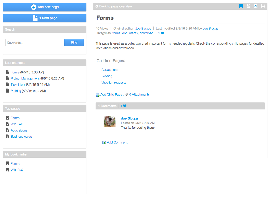 Die Darstellung von Wiki-Seiten erfolgt dabei zweispaltig. Auf der linken Seite stehen zu jedem Zeitpunkt eine Suchfunktion sowie die Möglichkeit zur Anlage von neuen Seiten zur Verfügung. Eine Auflistung der zuletzt geänderten, der am besten bewerteten und der vom Nutzer mit Lesezeichen versehenen Seiten schafft Übersicht. Das Wiki selbst erscheint auf der rechten Seite und bietet zunächst eine alphabetische Darstellung aller Seiten, die als Ausgangspunkt dient.